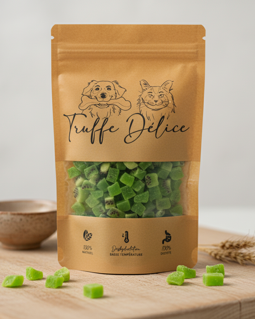 Les friandises de kiwi Truffe Délice sont une alternative originale et saine aux friandises carnées. Déshydratées avec soin, elles conservent toutes leurs qualités nutritionnelles et leur goût naturellement sucré. 100 % naturelles, sans céréales, sans gluten et sans additifs, elles apportent variété et gourmandise à l’alimentation de votre chien.