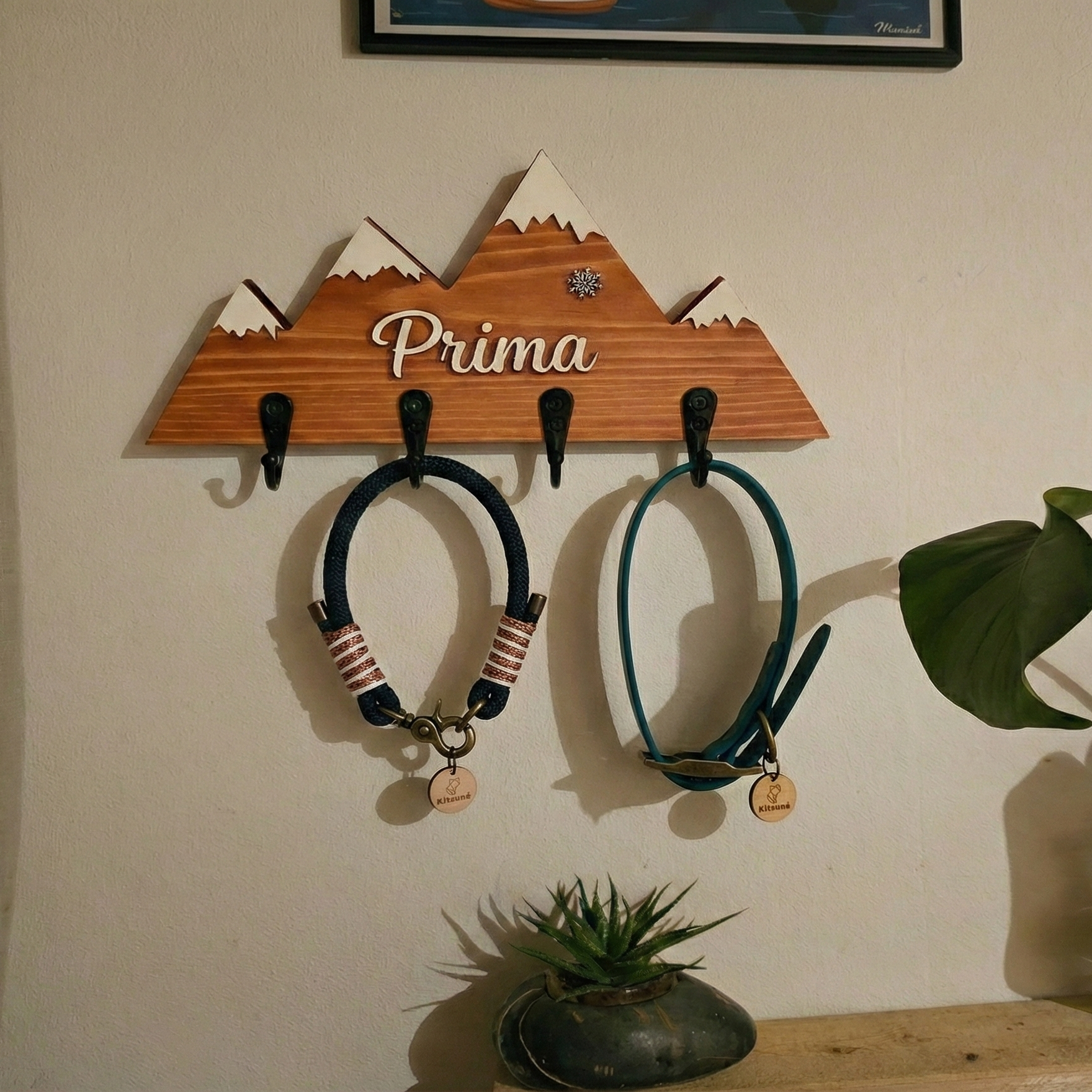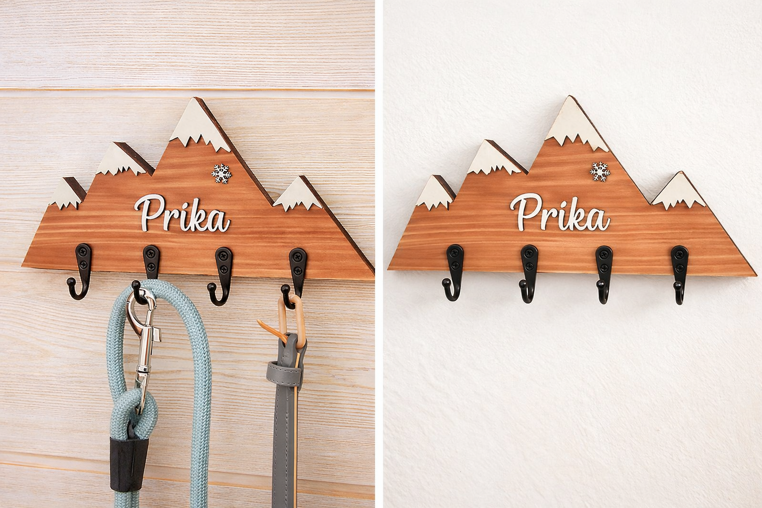 Équipé de 4 crochets noirs en métal, il permet de suspendre facilement laisse, collier, harnais ou tout autre accessoire du quotidien. À la fois décoratif et fonctionnel, il trouve naturellement sa place dans une entrée, un couloir ou un espace dédié à votre animal.